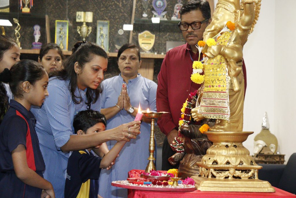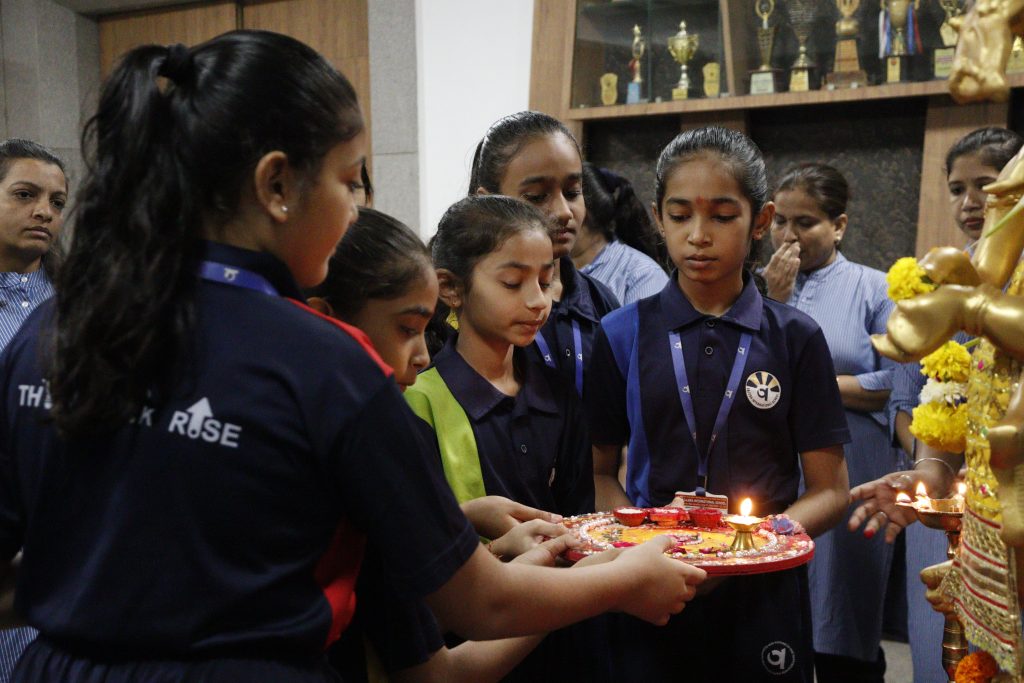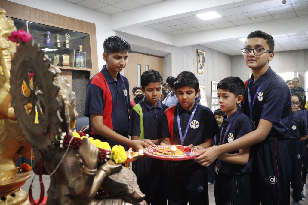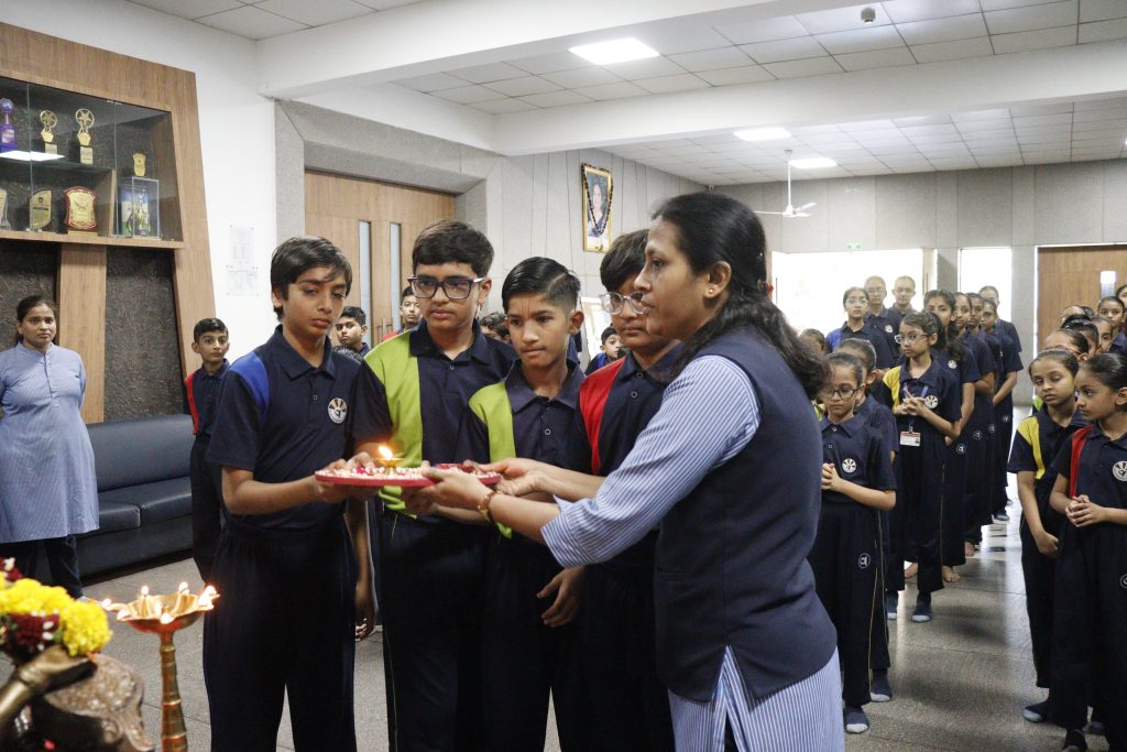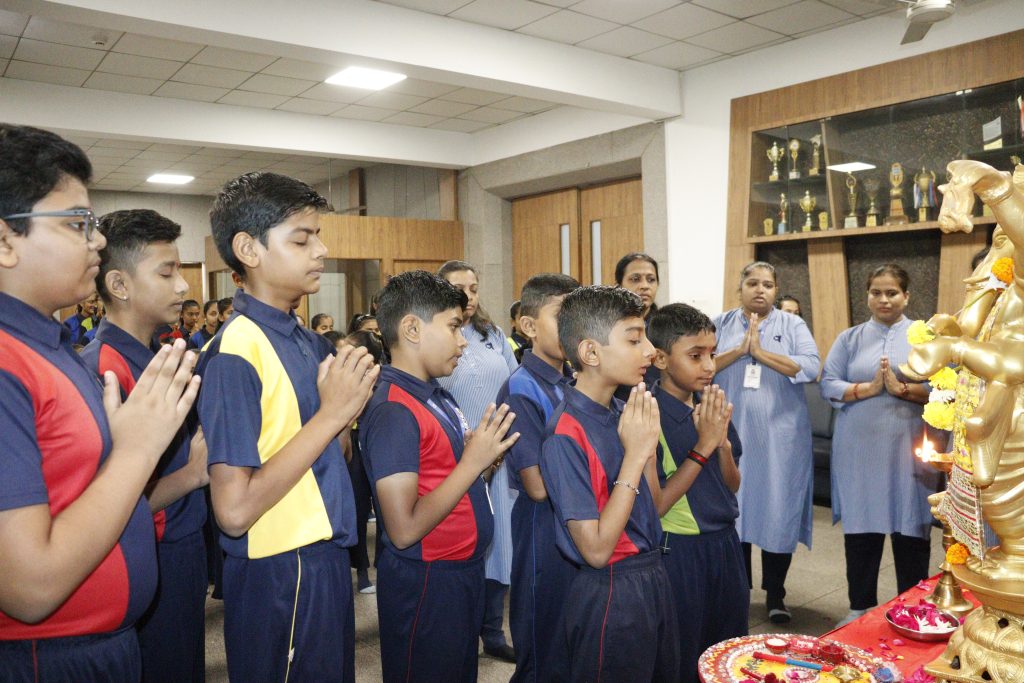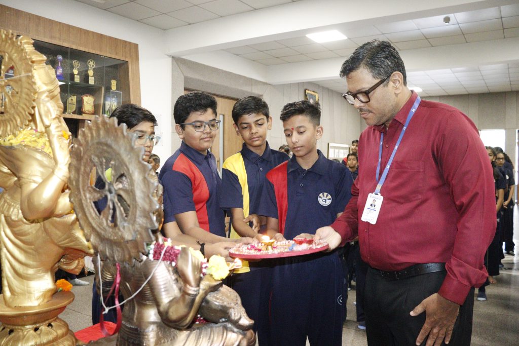 Teachers and staff participated wholeheartedly, guiding students to understand the significance of these traditions—invoking knowledge, wisdom, and success in all their endeavors. Each student received tilak during the arti, making them feel welcomed, blessed, and motivated for the year ahead.