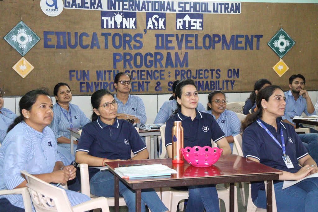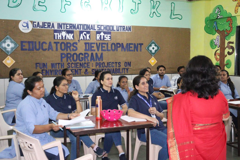 Today, Gajera International School, Utran hosted an educators’ development program for science educators from Katargam, Pal, and Utran branches. The engaging session, titled “Fun with Science: Projects on Environment & Sustainability,” was led by the esteemed resource person, Ms. Kanchan Joshi. With her exceptional expertise, Ms. Joshi guided the educators in exploring innovative ways to make science learning fun and interactive.